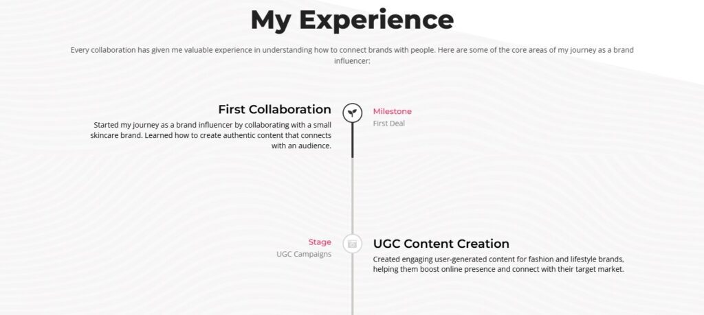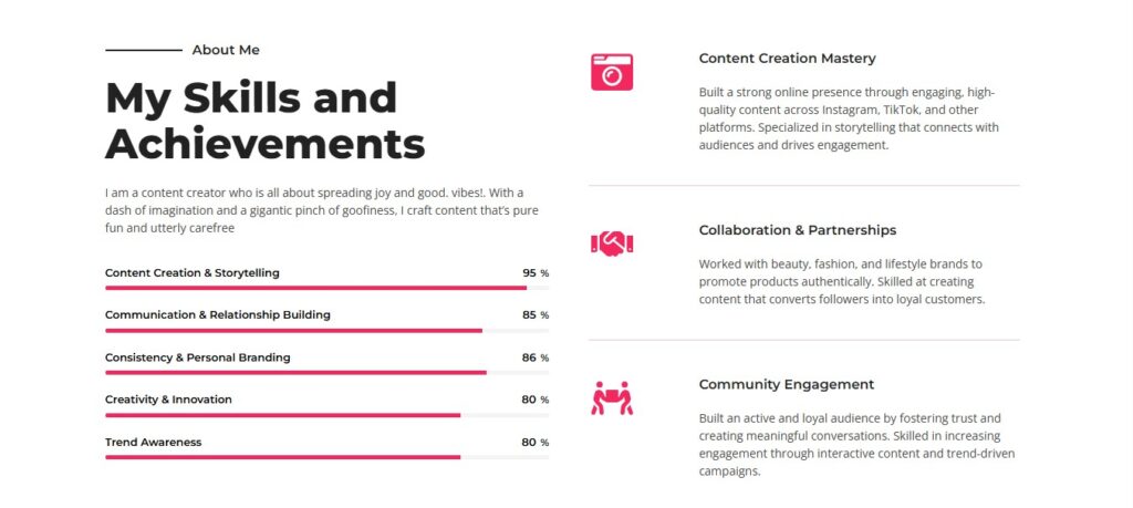 This project showcases a sleek, personal site for a rising TikTok influencer. It highlights her content, collaborations, and connects her with brands. Simple, bold, and creator-focused.